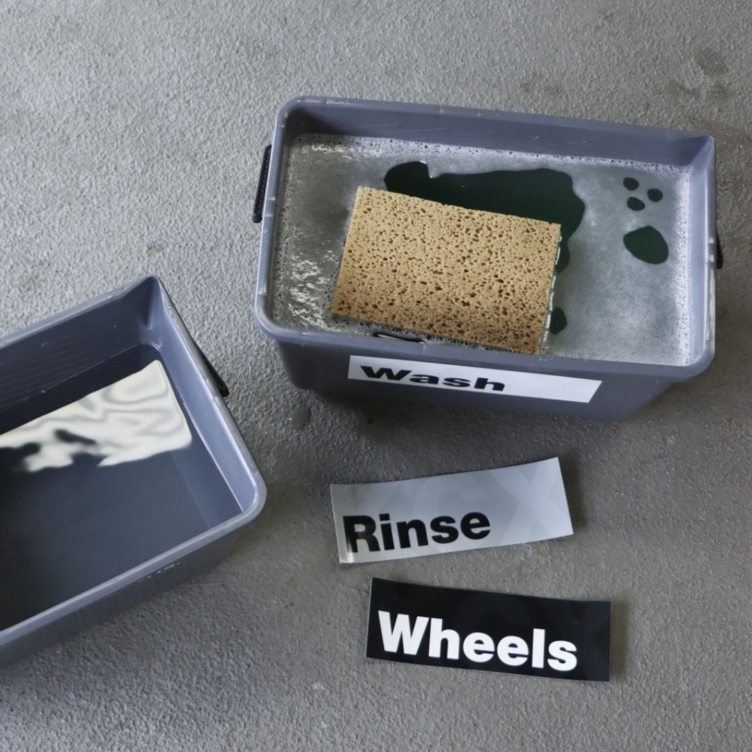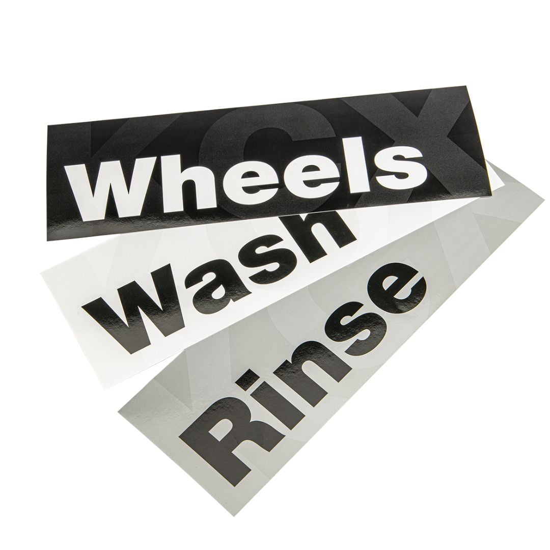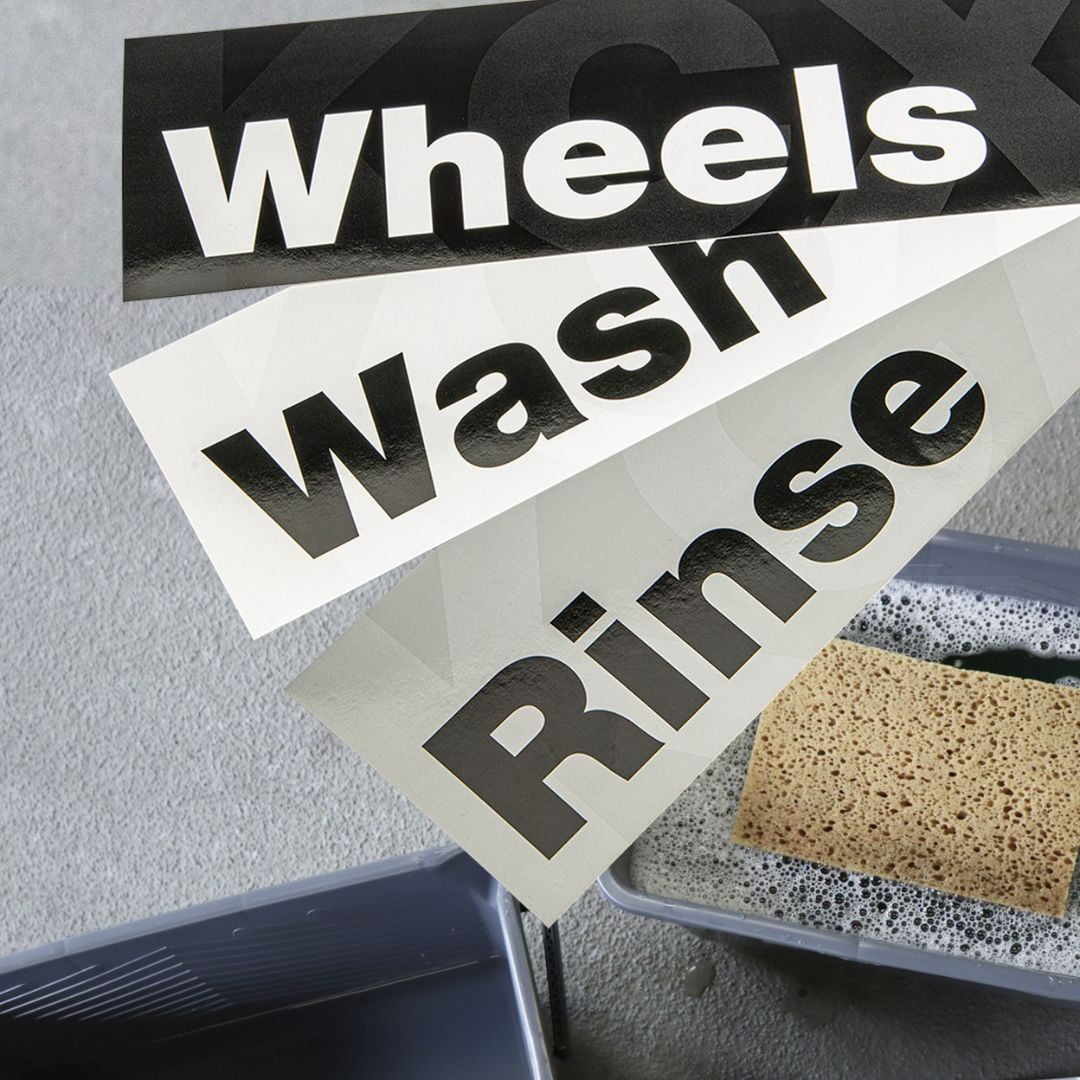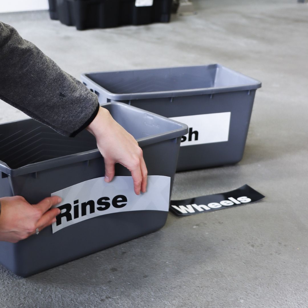 Set di 3 adesivi lucidi per secchi da lavaggio “Risciacquo”, “Lavaggio” e “Ruote”; adesivi permanenti con vernice protettiva, resistenti all’acqua e ai prodotti chimici.